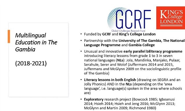 The third talk in our series provided an insightful discussion of challenges within multilingual education. Focusing specifically on The Gambia, Dr Clyde Ancarno (King’s College London) and Mr Momodou Jeng (Ministry of Secondary and Basic Education – The Gambia) discussed their Multilingual Education in The Gambia project. The project, running from 2018 to 2021, is funded by the Global Challenges Research Fund and King’s College London and is a partnership between King’s College London, the University of The Gambia, The National Language Programme and Gambia College. Their research focuses on an ‘unusual and innovative’ early parallel biliteracy programme which introduces literacy lessons from grade 1 to 3 in seven national languages (Jola, Mandinka, Manjako, Pulaar, Serahule, Serer and Wolof). This means that, since 2015, literacy lessons happen both in English and in national languages.